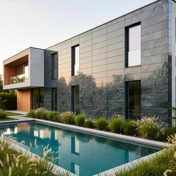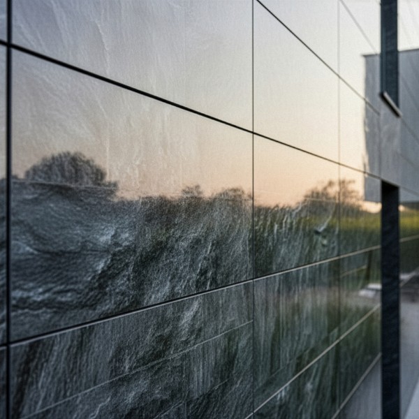 Detailaufnahme einer Solarfassade mit bedruckter Marmorstruktur – elegante Architektur mit integrierter Photovoltaik